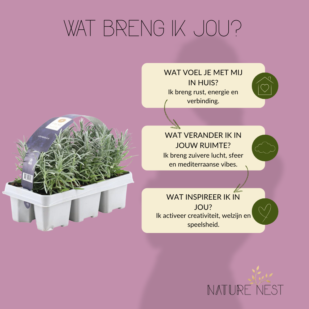 Ik ben jouw nieuwe geurige vriendin met een tikje attitude! Ik ben de Lavandula angustifolia, maar je mag me gewoon Lavendel noemen. Met mijn compacte, grijsgroene blaadjes en mijn paarse bloemen die in de zomer voluit stralen, breng ik een vleugje harmonie en puur natuur in jouw tuin of op je terras. Ik ben niet zomaar een plant, ik ben een stukje levend geluk, een vleugje Provence in jouw eigen groene paradijs. En ja, ik ben winterhard, dus ik blijf ook in de koude maanden trouw aan jouw buitenruimte. Klaar om samen te groeien?