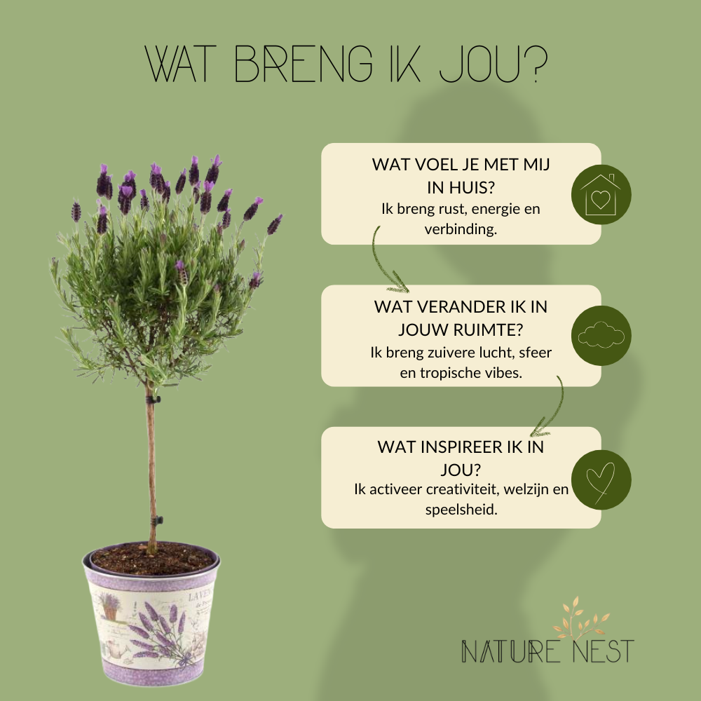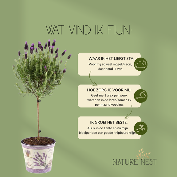 - Lavandula stoechas op stam 2: Net zo charmant en vol karakter als mijn partner, ik ben perfect om jouw entree of balkon een mediterrane vibe te geven. Samen brengen wij leven en plezier in jouw buitenruimte.