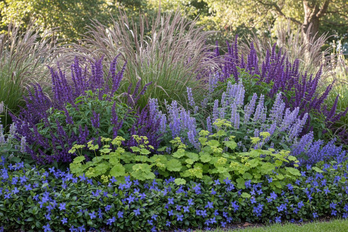 – 5 m² set: 10x Calamagrostis, 10x Salvia, 10x Nepeta ‘Walker’s Low’, 5x Alchemilla mollis, 5x Vinca minor