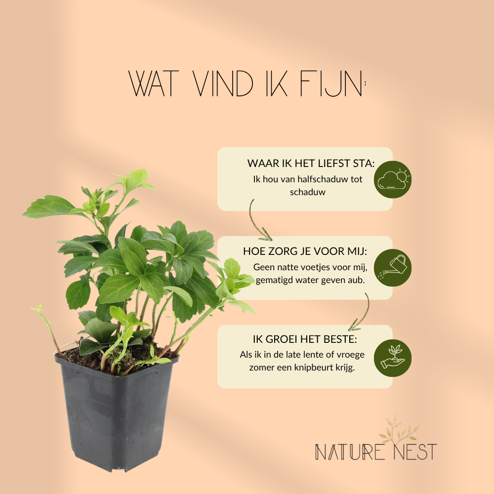 Ik ben jouw nieuwe groene vriendin, het Dikkemanskruid, ook wel Pachysandra terminalis genoemd. Met mijn stoere, winterharde karakter en mijn prachtige, altijd groene blaadjes breng ik een vleugje harmonie en levendigheid in jouw tuin, zelfs op de schaduwrijke plekjes waar anderen het lastig vinden. Ik ben niet zomaar een plant, ik ben een echte grondbedekker met een beetje attitude, die jouw tuin het hele jaar door een frisse, natuurlijke uitstraling geeft. En geloof me, ik ben niet bang voor een beetje kou – tot wel -20 °C houd ik mijn plekje stevig vast!