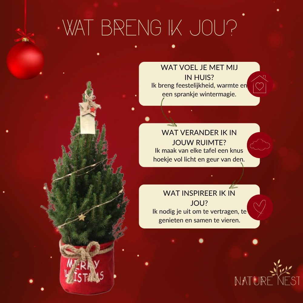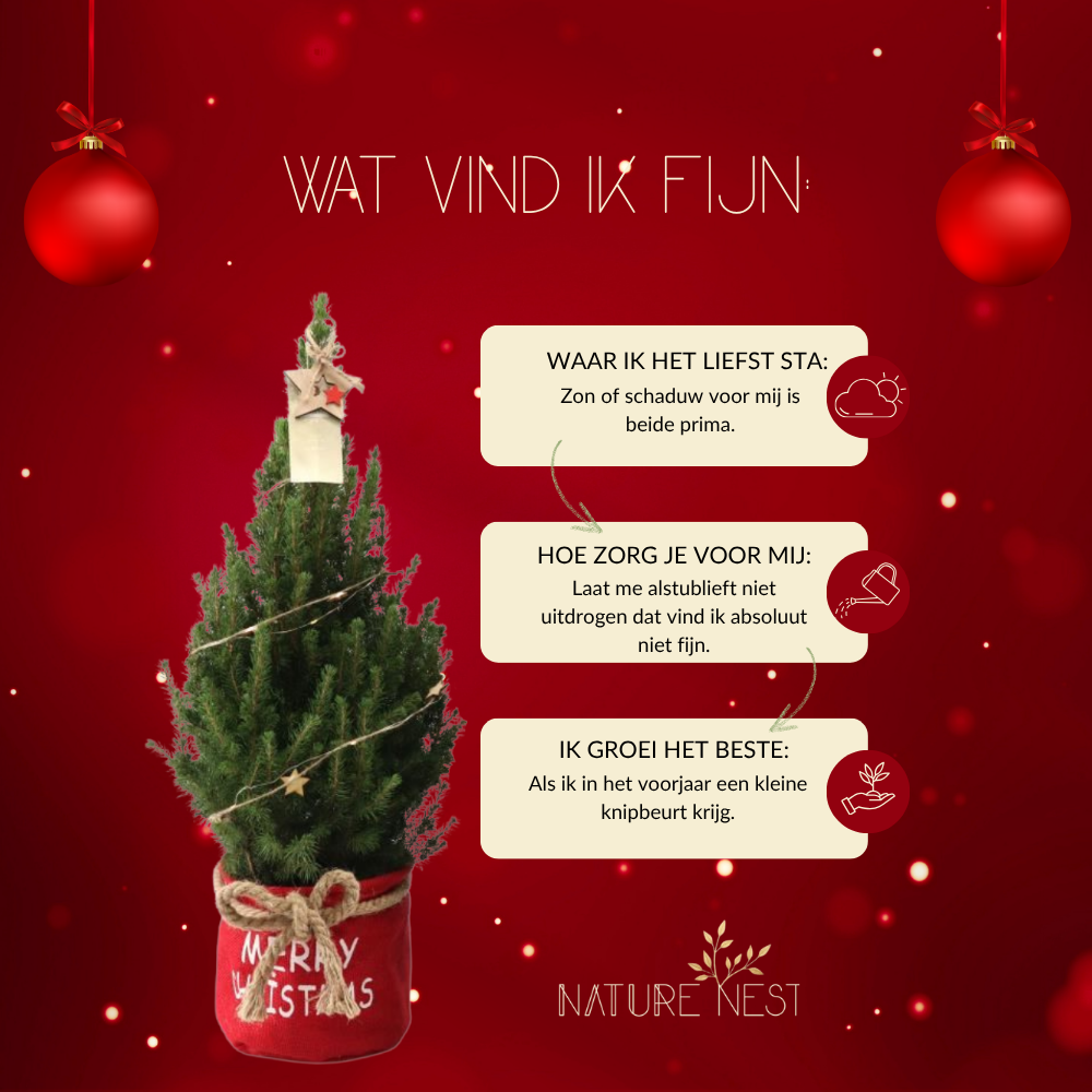 Ik voel me het allerbeste op een gezellig plekje binnen, waar ik mijn lichtjes kan laten stralen en jouw winteravonden kan opvrolijken. Zet me op je tafel, vensterbank of een knus hoekje waar ik mijn charme kan laten zien. En weet je wat zo fijn is? Na de feestdagen mag ik gewoon naar buiten, de tuin in, waar ik langzaam kan groeien en generaties lang jouw groene vriend kan zijn. Een beetje geduld en liefde, en ik beloon je met mijn volle, natuurlijke pracht.